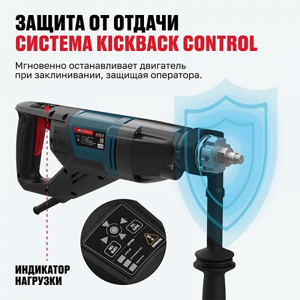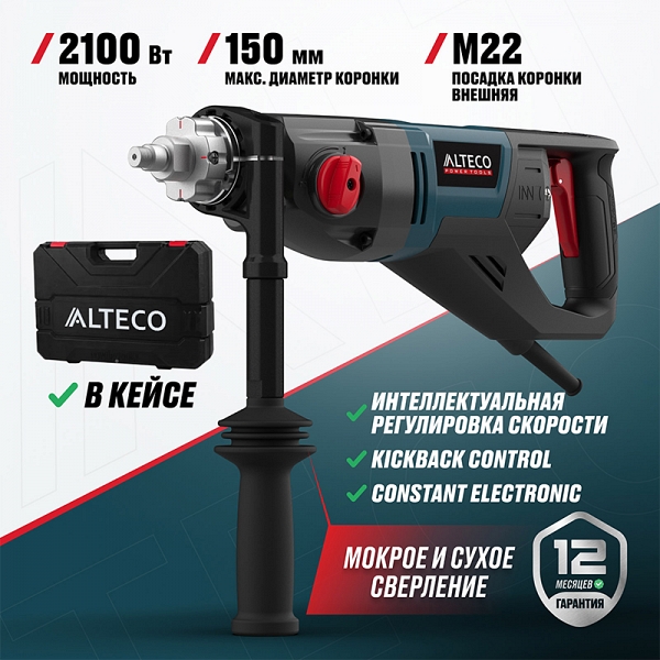 Дрель алмазного бурения с микроударом Alteco DD 21-150 GIK (Альтеко ДД 21-150 ГИК) с мощным двигателем 2100 Вт, интеллектуальной регулировкой скорости, системой KickBack Control и Constant Electronic – профессиональный инструмент для мокрого и сухого сверления бетона, кирпича и камня. Мощный двигатель 2100 Вт и функция микроудара обеспечивают высокую производительность и легкость прохождения твердых материалов. Легкий корпус и антивибрационная рукоятка делают работу комфортной даже при длительном использовании.