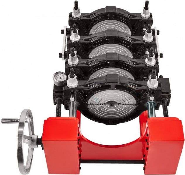 - Центратор с 4-мя откидными зажимами, редуктором и манометром имеет большой запас прочности за счет качественного сплава и ребер жесткости, что позволяет сваривать полимерные трубы с любым показателем SDR
