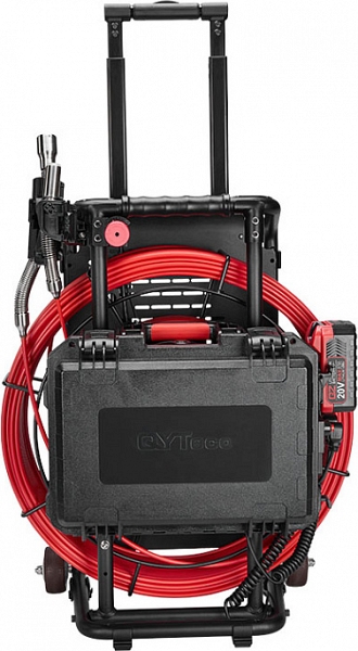 - Головка камеры Ø 21 × 45 мм и проталкиваемый кабель Ø 5,3 мм × 50 м из стекловолокна со счетчиком длины и системой торможения, подходящие для труб Ø 50 – 125 мм, длиной до 50 м