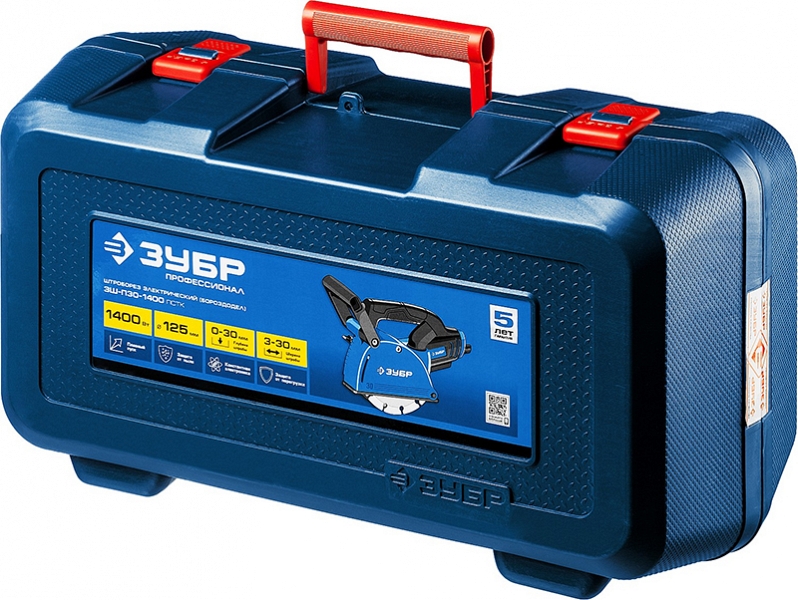 Штроборез Зубр Профессионал ЗШ-П30-1400 ПСТК (Zubr Professional ZSH-P30-1400 PSTK) – профессиональный инструмент для выполнения штроб глубиной до 30 мм и шириной 3 – 30 мм в легких и средних бетонах. Оснащен всеми современными электронными системами (плавный пуск, константная электроника, защита от перегрузки) для безопасности и большей производительности. Полная пылезащита всех узлов и комплектующие высокого класса гарантируют надежность. Расширенная (по сравнению с ЗШ-П30-1400 ПСТ) комплектация включает удобный кейс для хранения и переноски. Легкость и компактность позволяют длительно держать его на весу при работе на вертикальных поверхностях.
